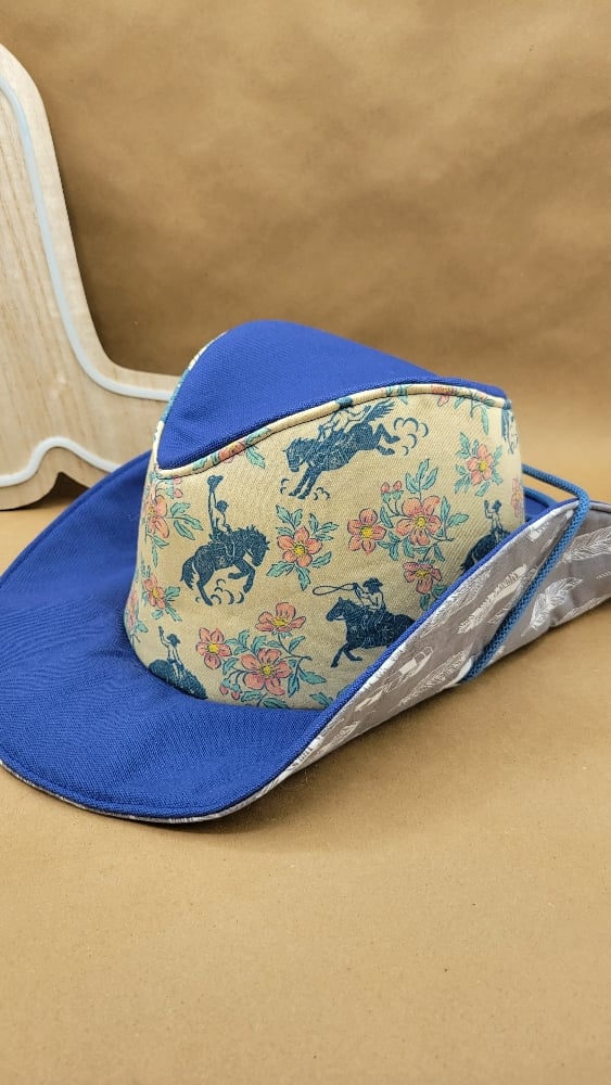Blue Cowboys - This hat features a dark blue canvas on the brim and top, then a printed fabric on the main panel that is western themed with flowers and cowboys on horses. The inside is a grey feather cotton fabric, with hand stitched binding.