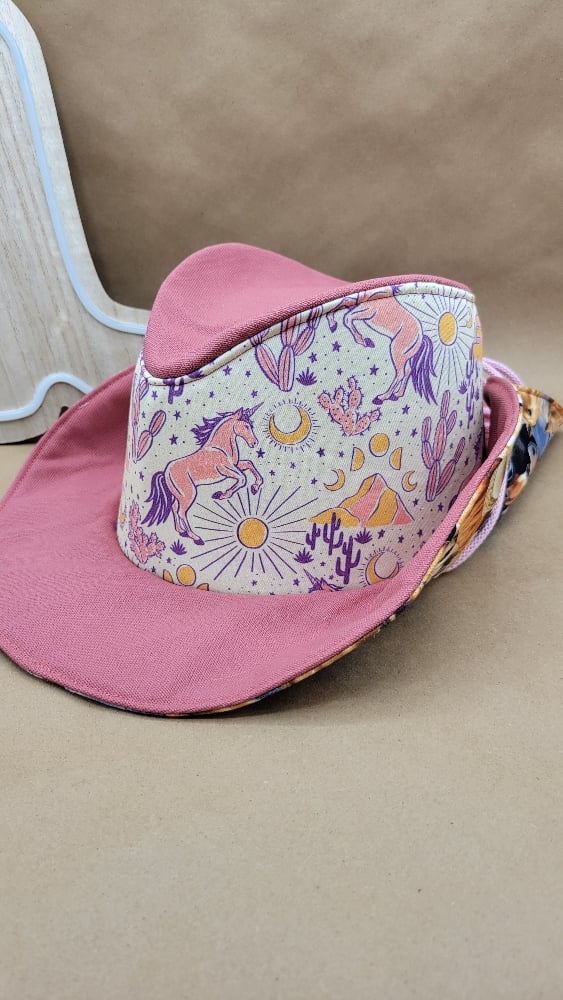 Pink Unicorns - This hat features a dusty pink canvas on the brim and top, then a printed fabric on the main panel that is western themed with mountains, cactus, and unicorns. The inside is horse themed cotton, with hand stitched binding.