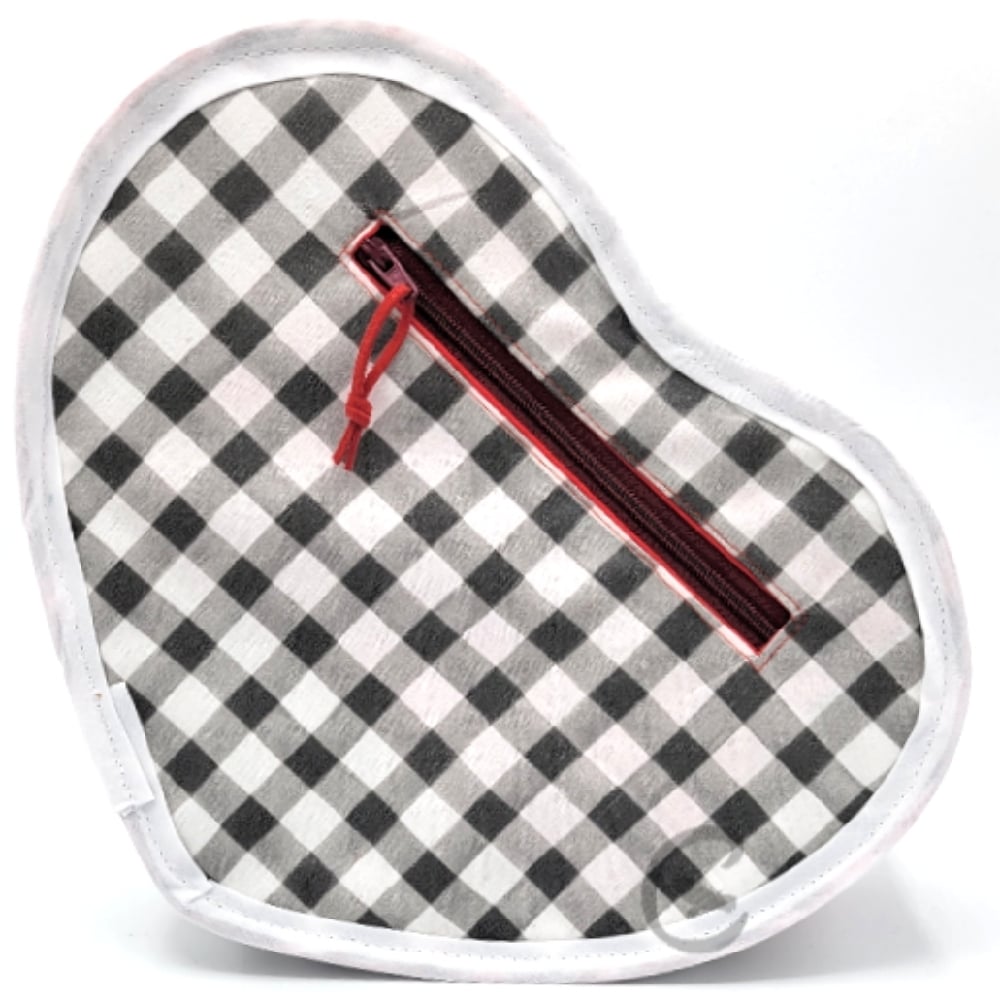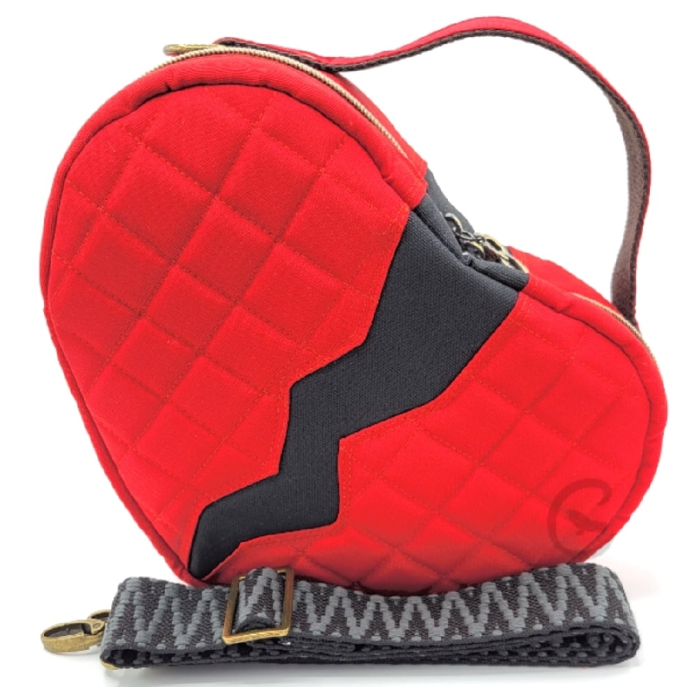 The Broken Heart bag features red cotton twill on the outside with black canvas for the split down the middle. It has been quilted in the red fabric, with a carry handle and a wide detachable strap in a black zigzag pattern.