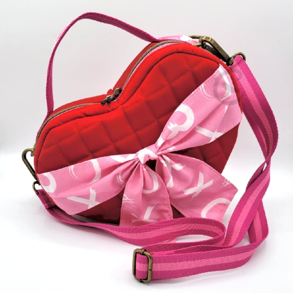 The Red Heart bag has a pink bow attached to the front. The bow is made from a chiffon fabric, with an X and O pattern on it. The bag itself is made with red cotton twill that has been quilted on the front and back, where a cork label has been attached. The carry handle is pink cotton webbing, with some of the chiffon added. The hardware of this bag is bronze.