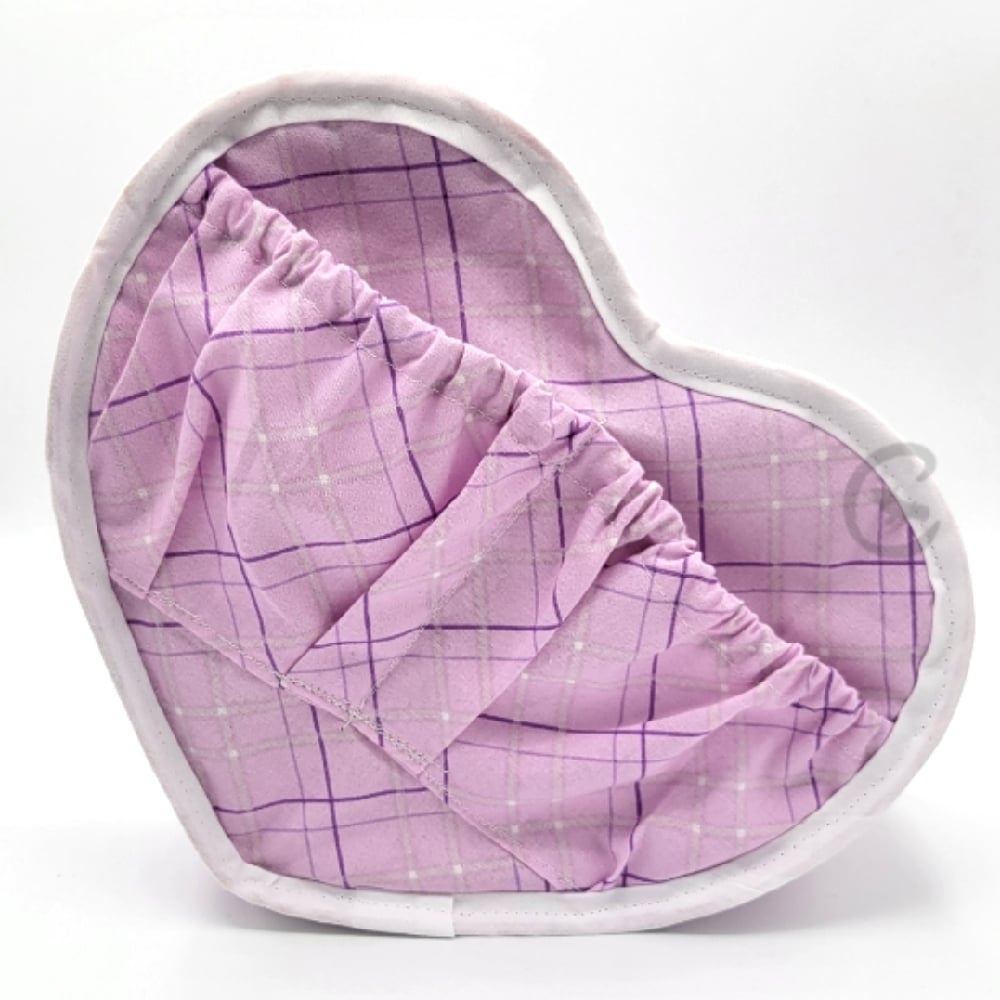The inside of the bag features a cotton fabric in a purple plaid design, with a divided pocket that has some elastic to add depth. There is white binding on the inside seams. The adjustable strap of the bag is two shades of pink cotton webbing.