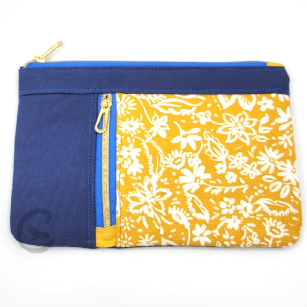 Blue and Gold - this bag is made with blue canvas on the outside, and a yellow cotton canvas with a floral design on the front pocket. The back is more solid blue, a shop logo, and decorative stitching. Inside there is blue cotton and a slip pocket featuring butterflies. This clutch does not come with a matching wrist strap.