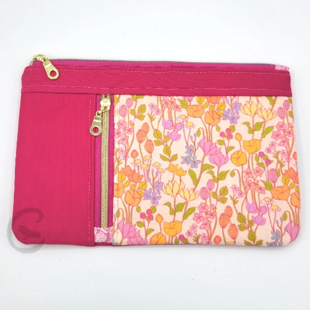 Pink Florals - this bag is made with pink twill on the outside, and a cotton with a floral design on the front pocket. The back is more twill, a shop logo, and decorative stitching. Inside there is pink cotton with flowers and a slip pocket. This clutch does not come with a matching wrist strap.