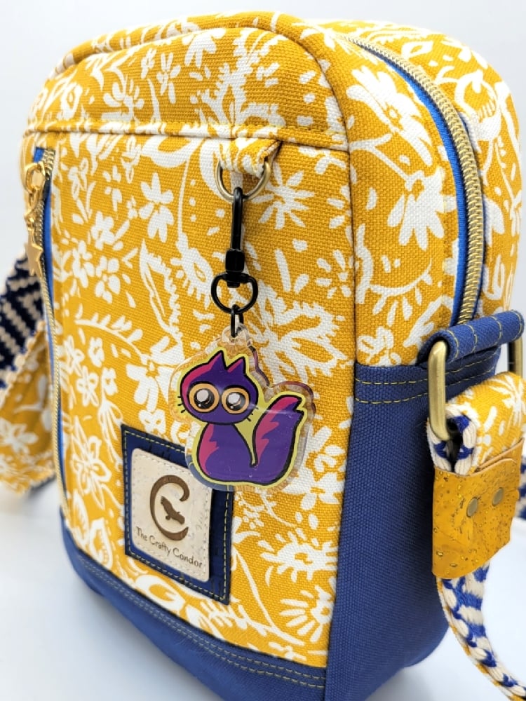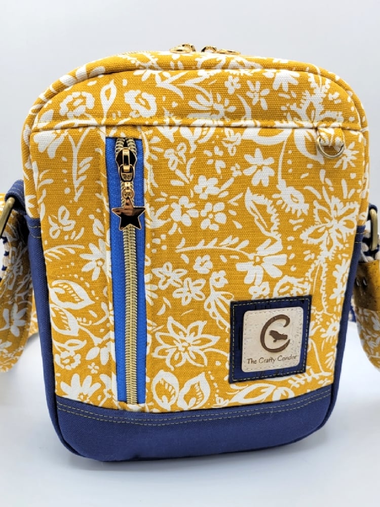 The outside of the bag is made from a mustard yellow canvas fabric with a white floral design. The front pocket has a gold star zipper pull, and there's a small D ring for attaching keychains for display. The base and back pocket of the bag is a dark navy blue canvas.