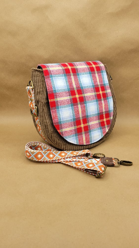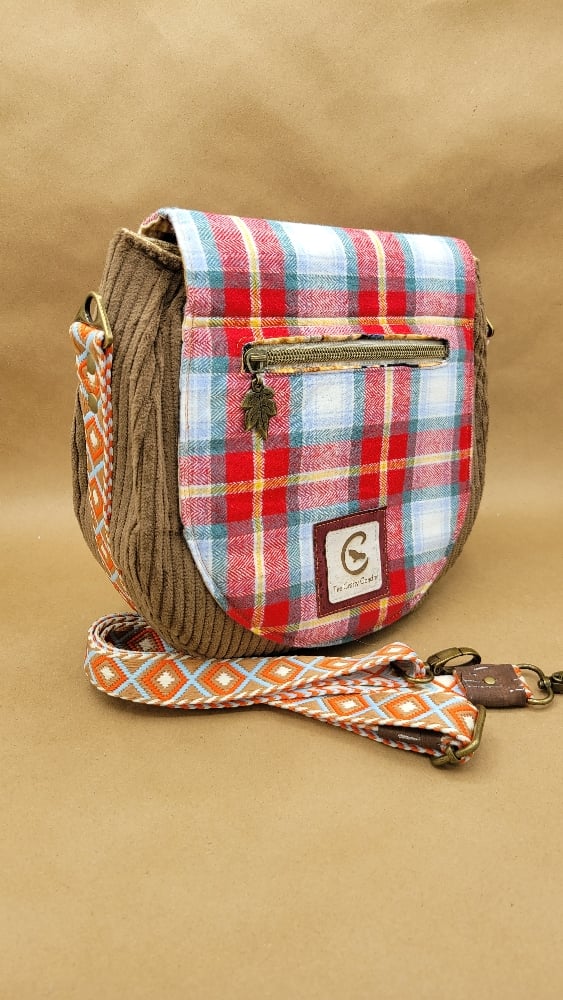 Red Plaid and Brown Corduroy - this bag features a lovely plaid flannel fabric on the flap, and a fuzzy brown corduroy fabric on the main body of the outside. There's a zipper pocket on the back. On the inside is a brown cotton fabric, and another zip pocket. The strap is a 1 inch wide nylon design with a western color scheme, and it is adjustable and removable.