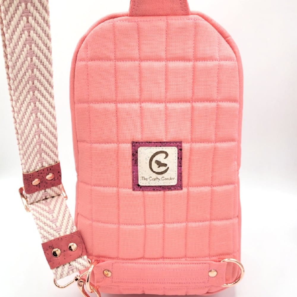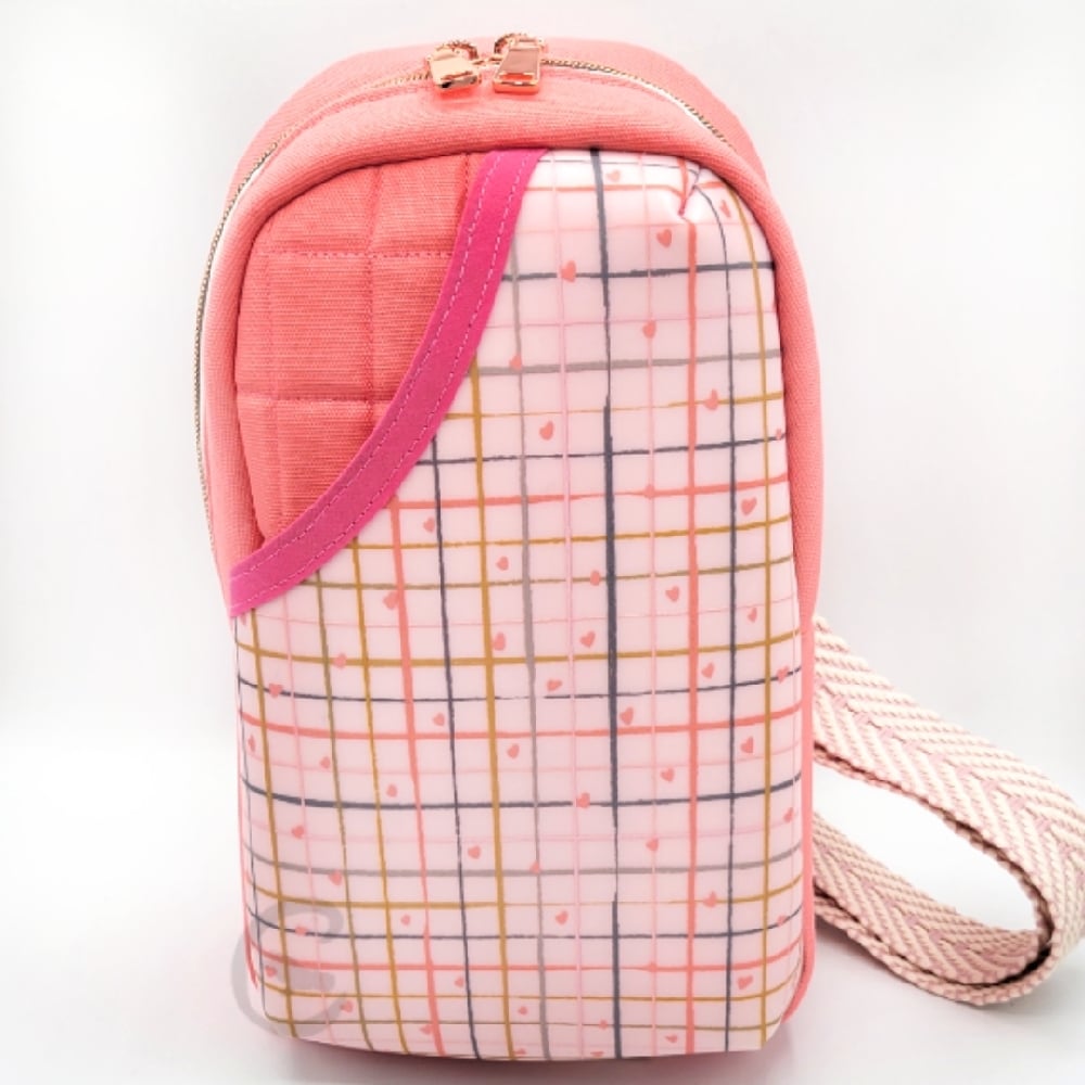 This bag features a light salmon pink canvas fabric on the outside, with a printed vinyl on the front open pocket with a cute pattern of plaid stripes and tiny hearts. The middle and back panels have been quilted in a square pattern with matching pink thread. There is also a cork label with my shop's logo on the back of the bag.