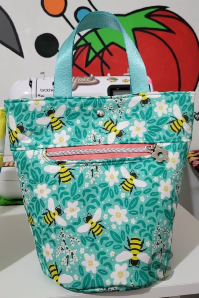 The outer fabric is a cotton canvas with a teal background color and a pattern of leaves, flowers and bees. There is a pink zipper on the front, with a silver pull.