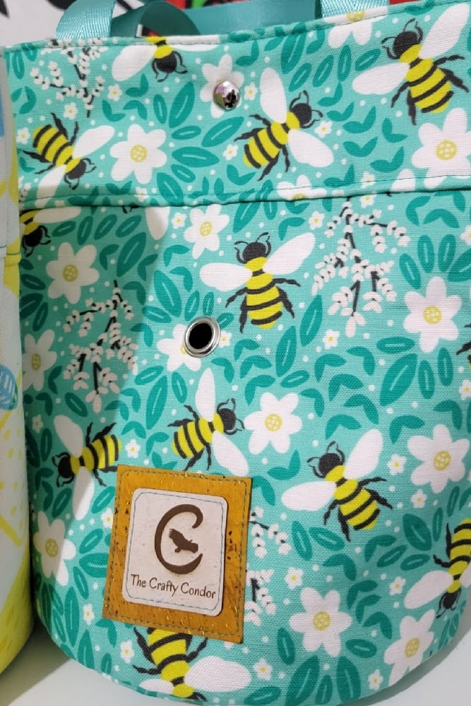 The back of the bag has my shop logo in a cork label, and a silver grommet set in the middle for threading yarn through to work on your project while "on the go" with the ball of yarn kept safely inside the bag with a magnetic closure at the top.