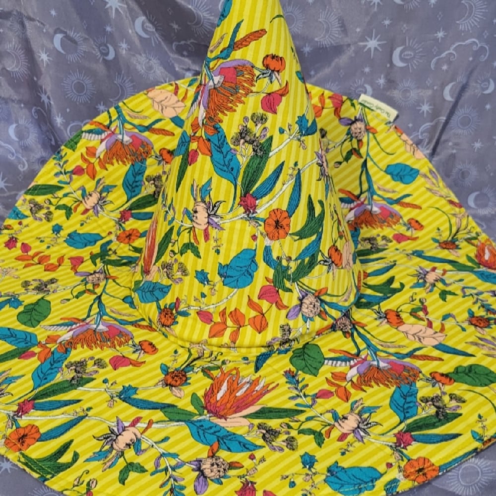 Yellow Florals - This hat is made with cotton fabric inside and out. The outside has subtle stripes in the background, with a mustard yellow color and then very pretty flowers scattered across in colors such as orange, blue, and green. The lining fabric is a dark yellow/green with flowers.