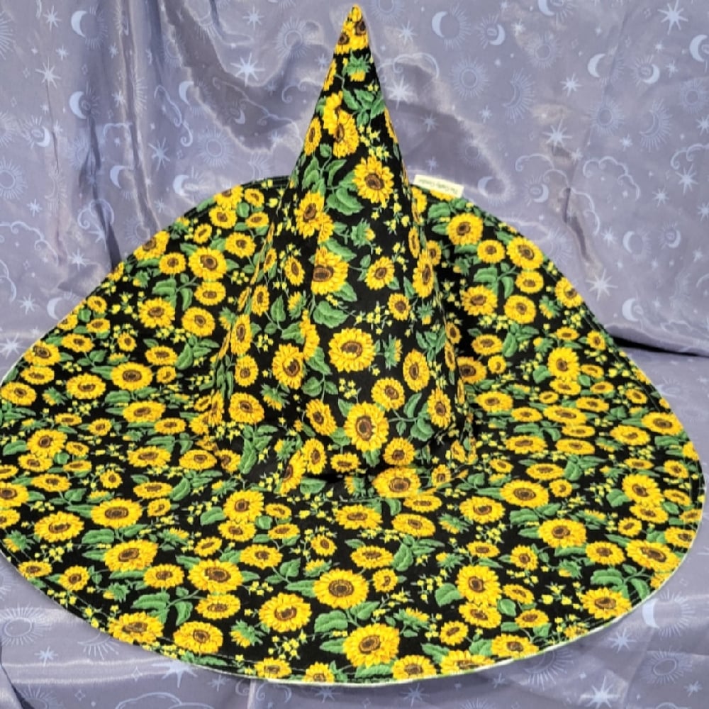 Sunflowers - This hat is made with cotton fabric inside and out. The outside fabric has a black background, and bright yellow sunflowers with green leaves. The lining fabric is a green plaid design.