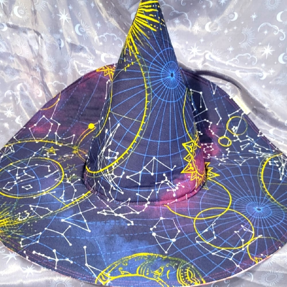 Moon and Stars - This hat is made with a lovely constellation canvas fabric, with blues and purples, white stars, and gold accents. The lining of the hat is a beautiful nebula themed cotton fabric.