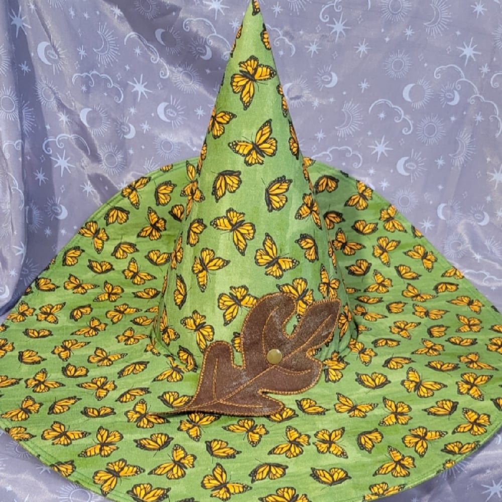 Butterflies - This hat is made with cotton fabric inside and out. The outside is a green background with orange butterflies. The inside is a dark green with speckles. It has 1 plastic snap, and the option of different accessories - brown leaf, brown bow, or black bat. These can be snapped onto the front as decoration.