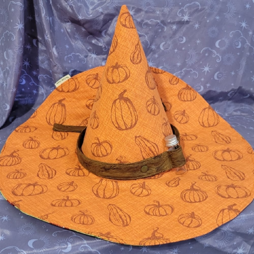 Pumpkins - This hat is made with a lovely orange canvas fabric, with brown pumpkin designs across it. The lining of the hat is a fun vegetable themed cotton fabric. The hat includes 2 plastic snaps, and comes with a brown fabric strap that has a little glass potion bottle. The strap is snapped into place on the front and back to keep it secure.